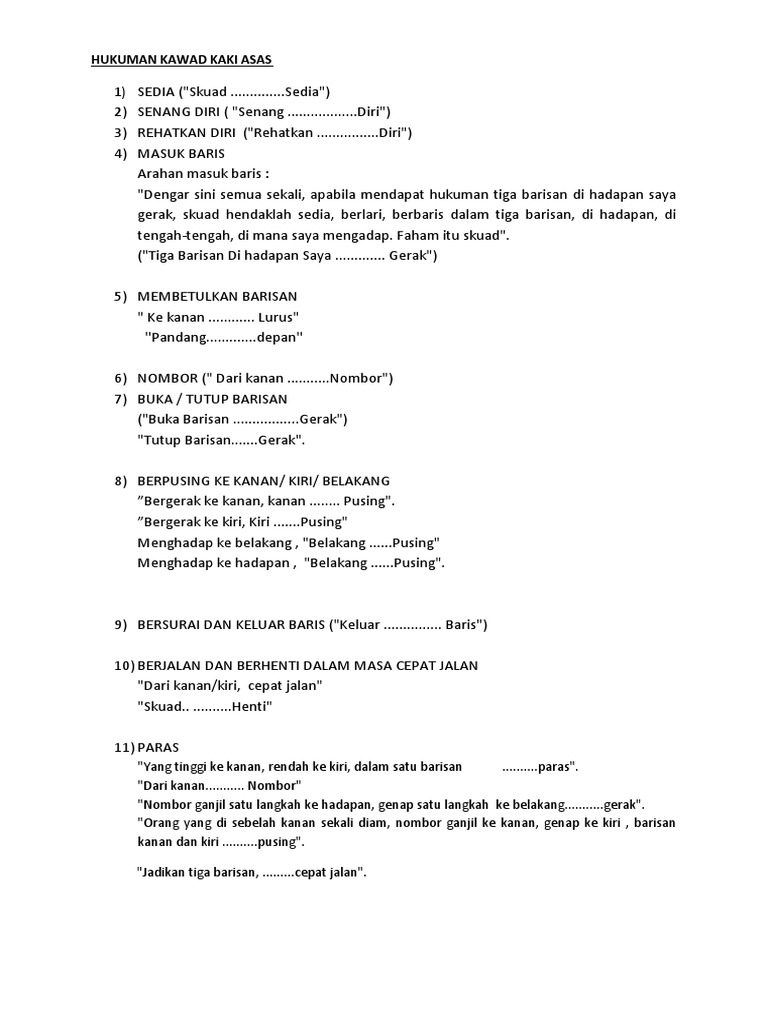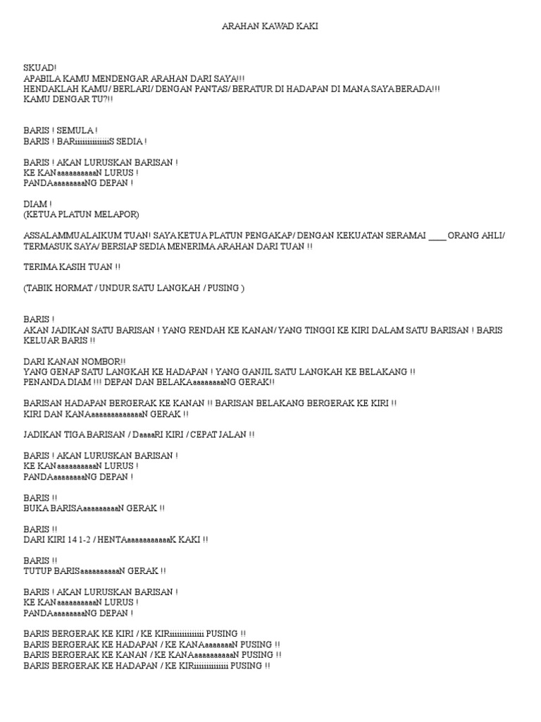 Arahan Kawad Kaki from imgv2-2-f.scribdassets.com Johan kawad kaki dan ketua platun terbaik pengakap daerah gombak smk hillcrest 2018. Latihan ini dilakukan oleh ahli pengakap pkk 224 petaling. Arahan kawad kakiarahan platun masuk ke padang kawad dari kanan… cepat jalan kanan belok 2x berhenti ke kanan pusing dari tengah cepat jalan berhenti buka barisan… gerak ke kanan… lurus pandang depan arahan ketua platun melapor diri assalamualaikum. Kawad kaki pengakap johan peringkat kebangsaan 2018. Peringkat negeri johan kawad kaki berpasukan johan keseluruhan platun komander terbaik johan kawad kaki individu. Pertandingan kawad kaki peringkat sekolah smktt 2018 gambar kawad boleh dapat pada link di bawah. Download lagu kawad kaki mp3 gratis dalam format mp3 dan mp4. Download mp3 kawad kaki gratis, ada 20 daftar lagu kawad kaki yang bisa anda download.
