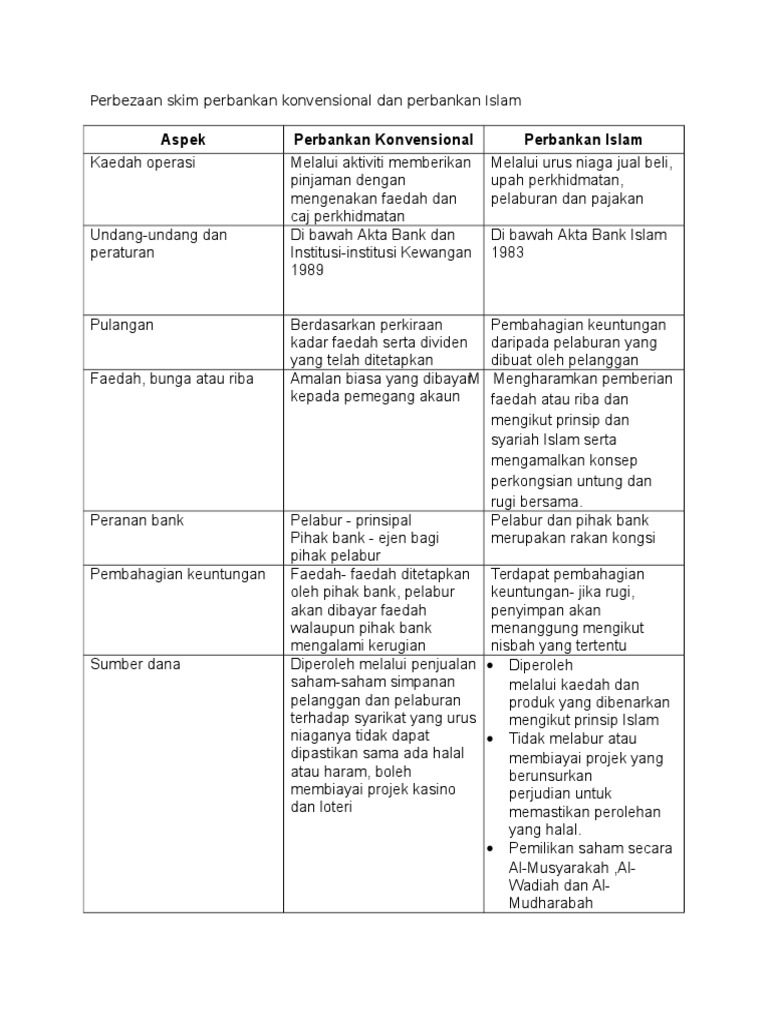 Dalam dunia perbankan di indonesia, secara umum terdapat dua jenis bank yakni bank syariah dan konvensional. 1wahyu ini kerana 'manual' yang allah bila akal dan pengalaman daripada allah s.w.t. Perbankan islam guna terma arab untuk halalkan. 2.sistem keuntungan dalam perbankan syariah dinamakan margin baik itu margin atas. Perbezaan konsep antara sistem perbankan islam dengan perbankan konvensional dapat dilihat dalam jadual perbandingan di bawah.