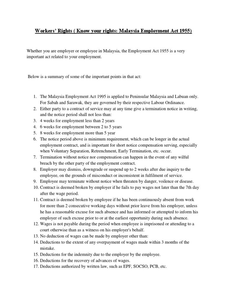 Understanding Malaysian Employment Act 1955 from image.slidesharecdn.com Employment act 1955 if the employee's salary does not exceed rm2,000 a month or falls within the first schedule of employment act 1955, then we will refer to the employment act 1955. Employment act 1955 an act relating to employment. The employment act, 1955 is the main legislation on labour matters in malaysia. Employment act 1955 defines 'employees' as individuals whose monthly wages are less than rm2,000 and those who are employed in manual work such as artisans, transport operators, supervisors, and domestic workers too are classified as employees even if their wages are above rm2,000. Under section 37 (1) of the act, female employees are entitled to maternity leave for a period of not less than 60. Employment law in malaysia is generally governed by the employment act 1955 (employment act). The most recent amendments were made on 1st april 2012 under the employment (amendment) act 1955 gazetted on 9th february 2012. The employment act 1955 (hereinafter known as 'the act') was first implemented in malaysia on 1st june 1957.